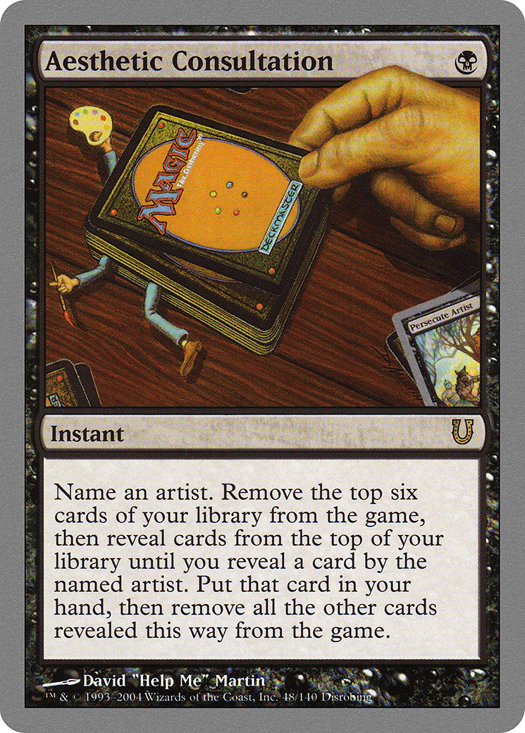 Choose an artist. Exile the top six cards of your library, then reveal cards from the top of your library until you reveal a card with art by the chosen artist. Put that card in your hand and exile all other cards revealed this way.