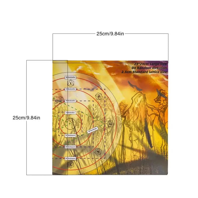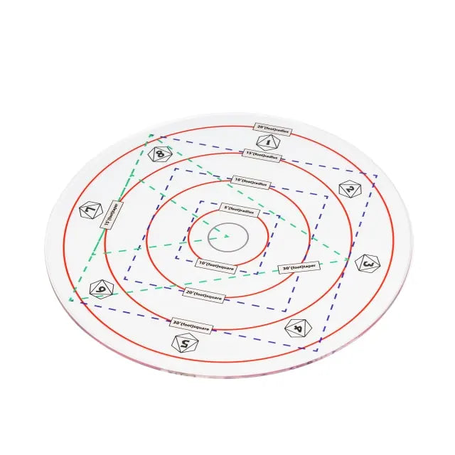 This AOE template has the ability to measure 20ft, 15ft, 10ft, and 5ft radiuses with ease. You will also find 30ft, 20ft,10ft cube, 15ft and 30ft cone. This template is transparent so you can see the battlefield through it to see which miniatures are affected. Take all the guesswork out of AoE, just enjoying fun and happy spellcasting!