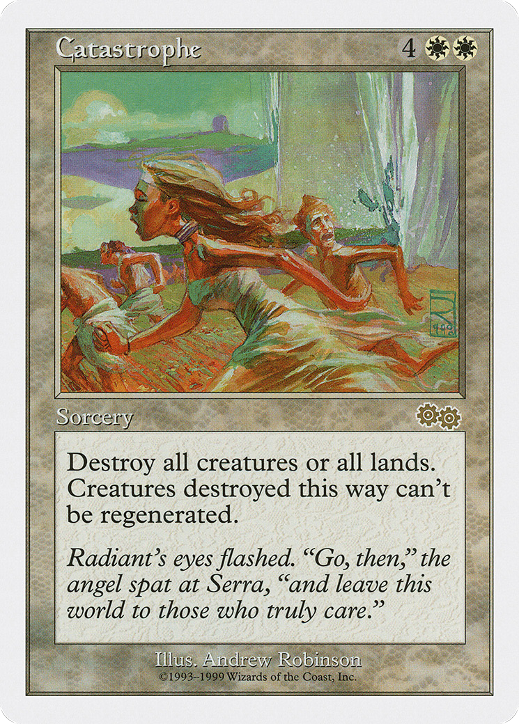 Destroy all lands or all creatures. Creatures destroyed this way can't be regenerated.