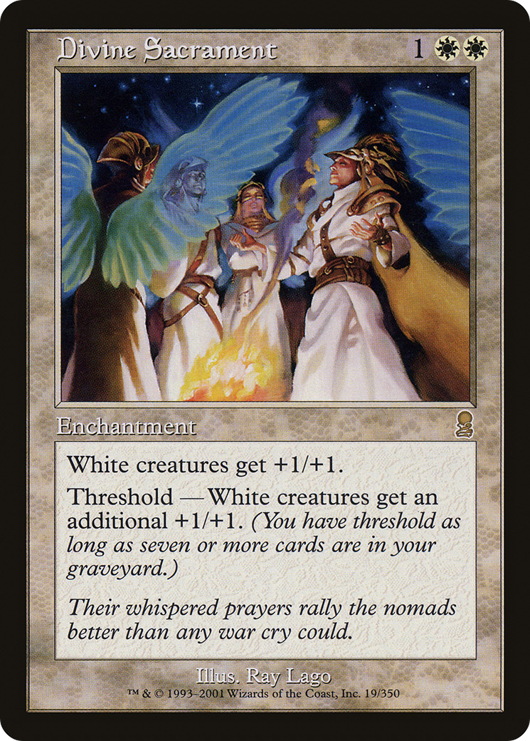 Threshold — White creatures get an additional +1/+1 as long as seven or more cards are in your graveyard.