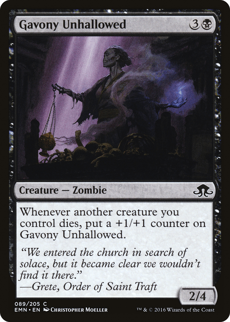 Whenever another creature you control dies, put a +1/+1 counter on Gavony Unhallowed.