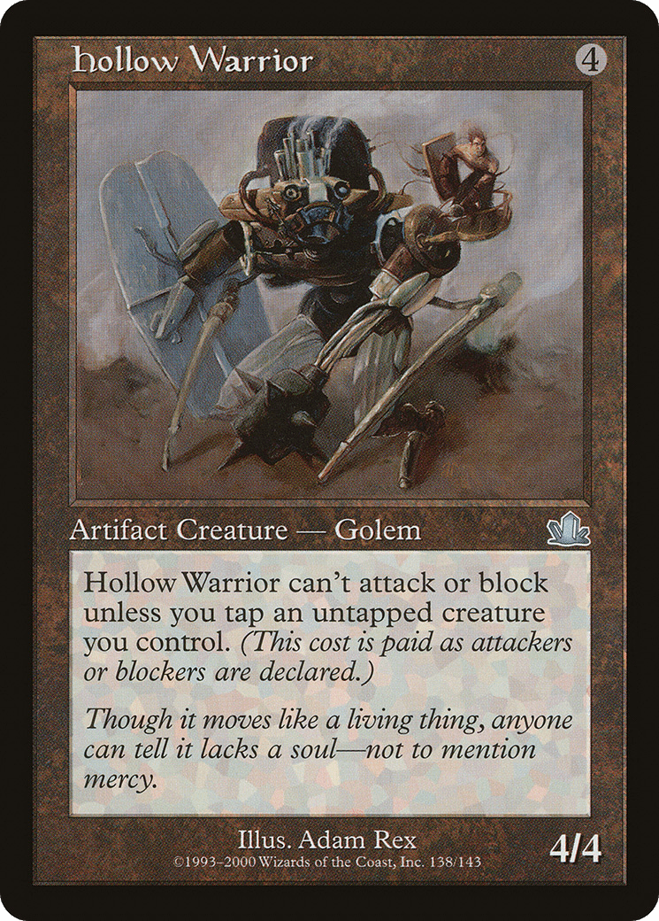 Hollow Warrior can't attack or block unless you tap an untapped creature you control not declared as an attacking or blocking creature this combat. (This cost is paid as attackers or blockers are declared.)