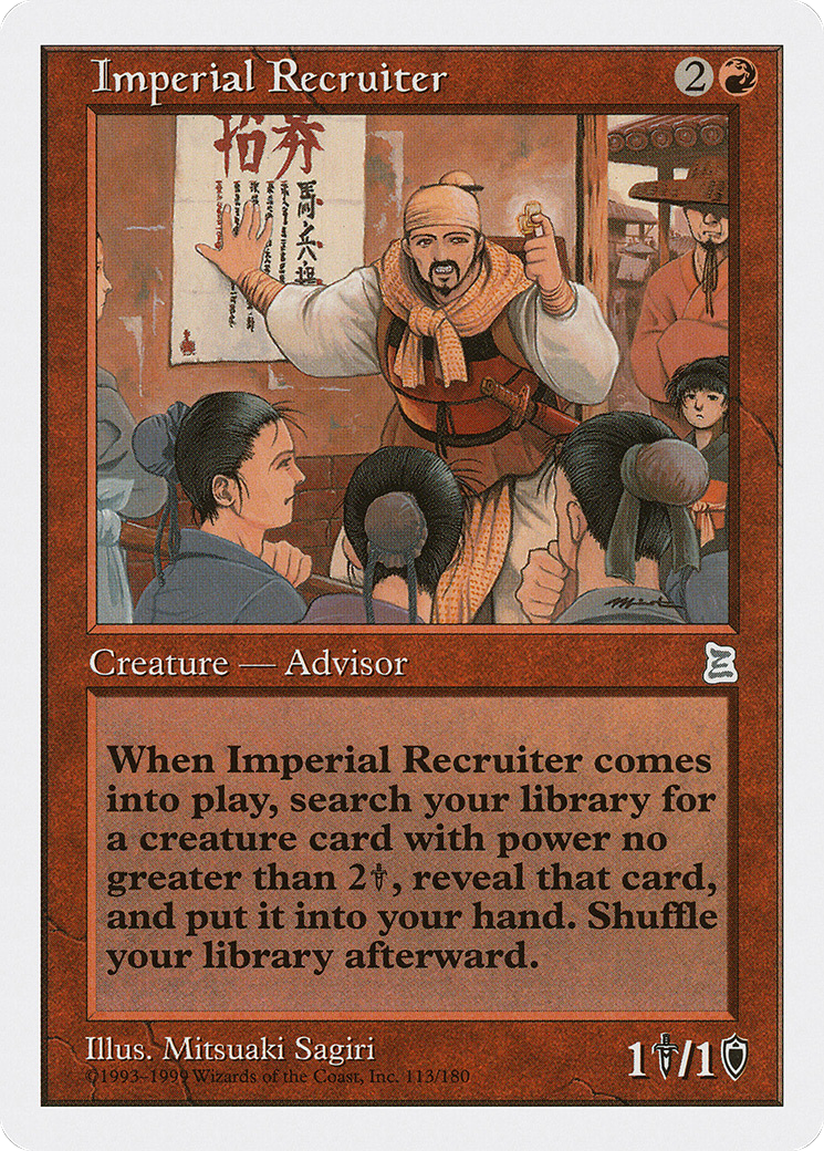 When Imperial Recruiter enters the battlefield, search your library for a creature card with power 2 or less, reveal it, put it into your hand, then shuffle.
