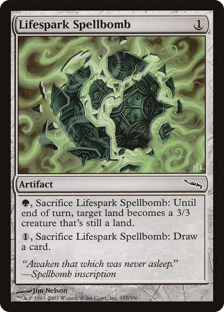 {G}, Sacrifice Lifespark Spellbomb: Until end of turn, target land becomes a 3/3 creature that's still a land.