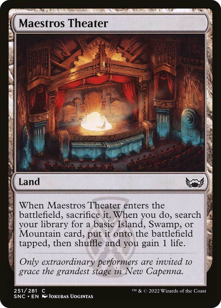 When Maestros Theater enters the battlefield, sacrifice it. When you do, search your library for a basic Island, Swamp, or Mountain card, put it onto the battlefield tapped, then shuffle and you gain 1 life.