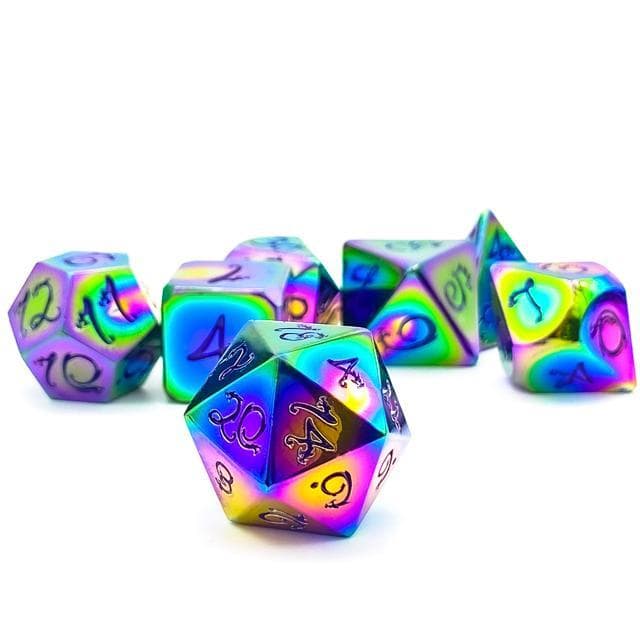 Metal Dice | Rainbow Chrome w/Dragon (Purple Ink) | Set of 7