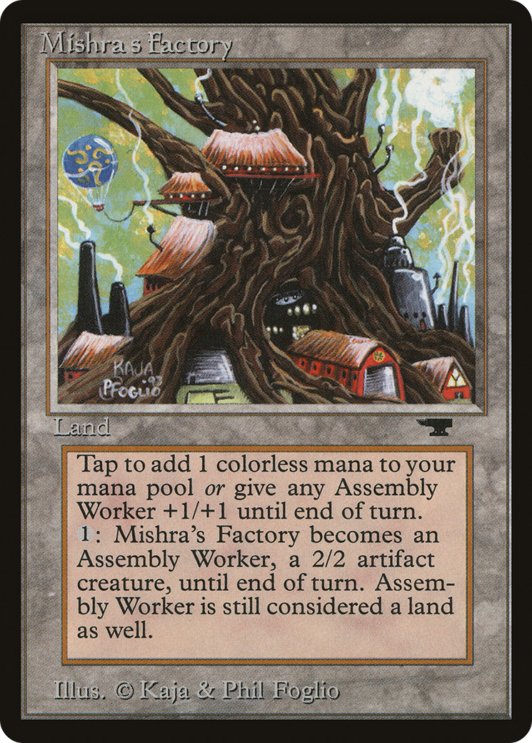 {1}: Mishra's Factory becomes a 2/2 Assembly-Worker artifact creature until end of turn. It's still a land.