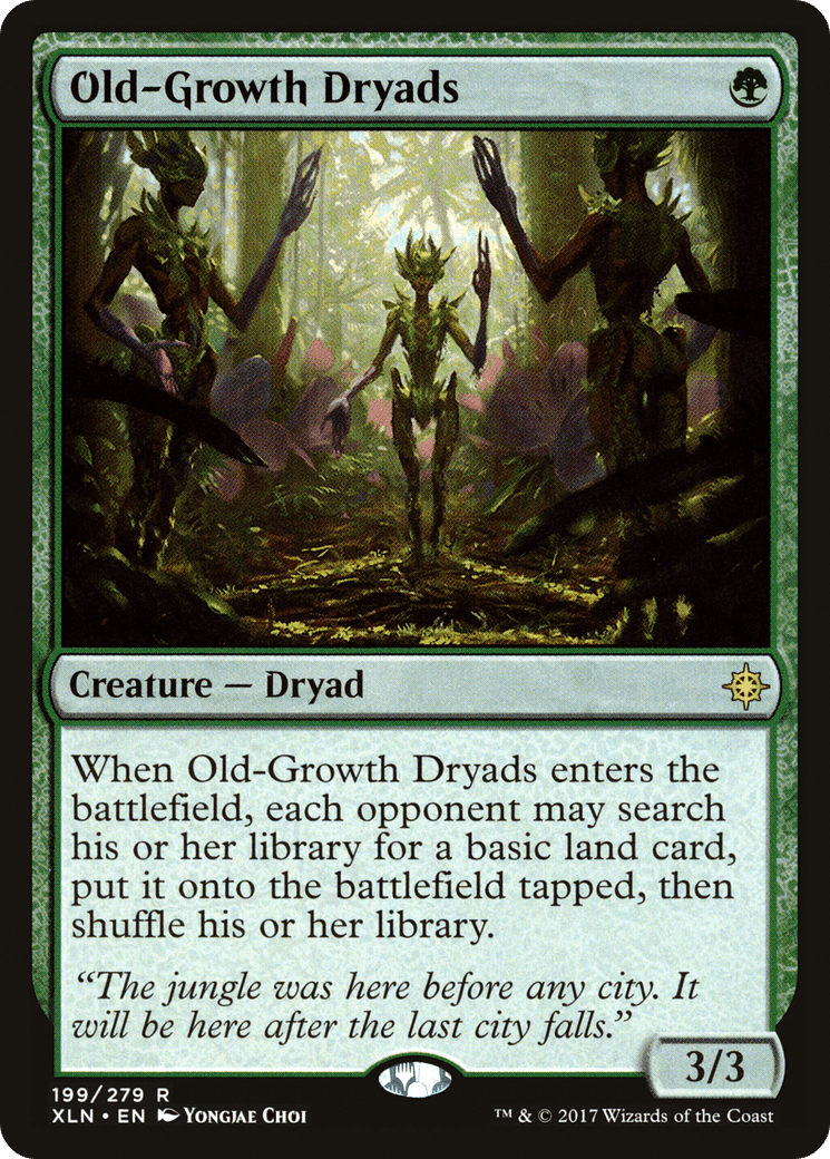 When Old-Growth Dryads enters the battlefield, each opponent may search their library for a basic land card, put it onto the battlefield tapped, then shuffle.