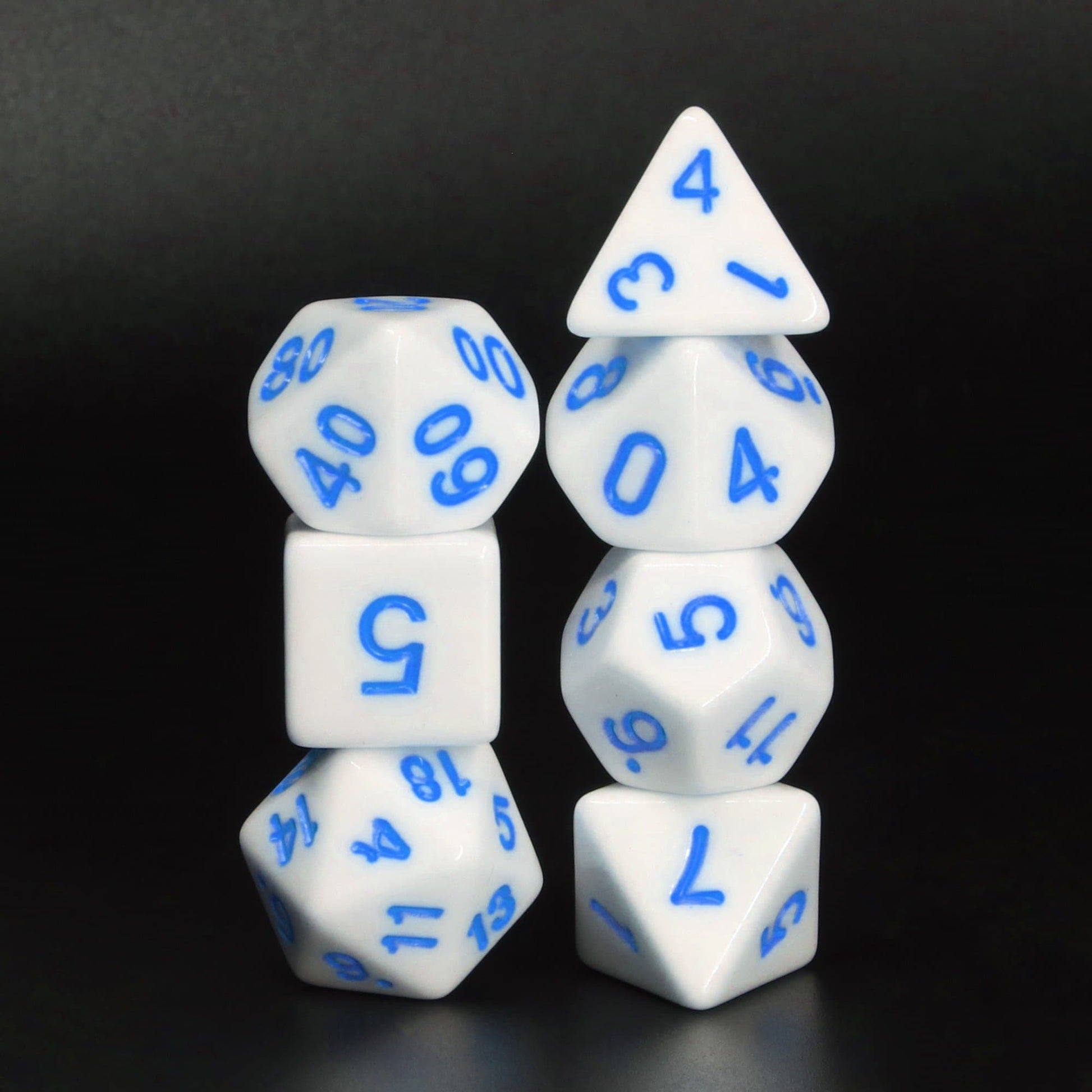 Polyhedral Dice Set | Acrylic | Solid White (Blue Ink) | Set of 7 (D0102)