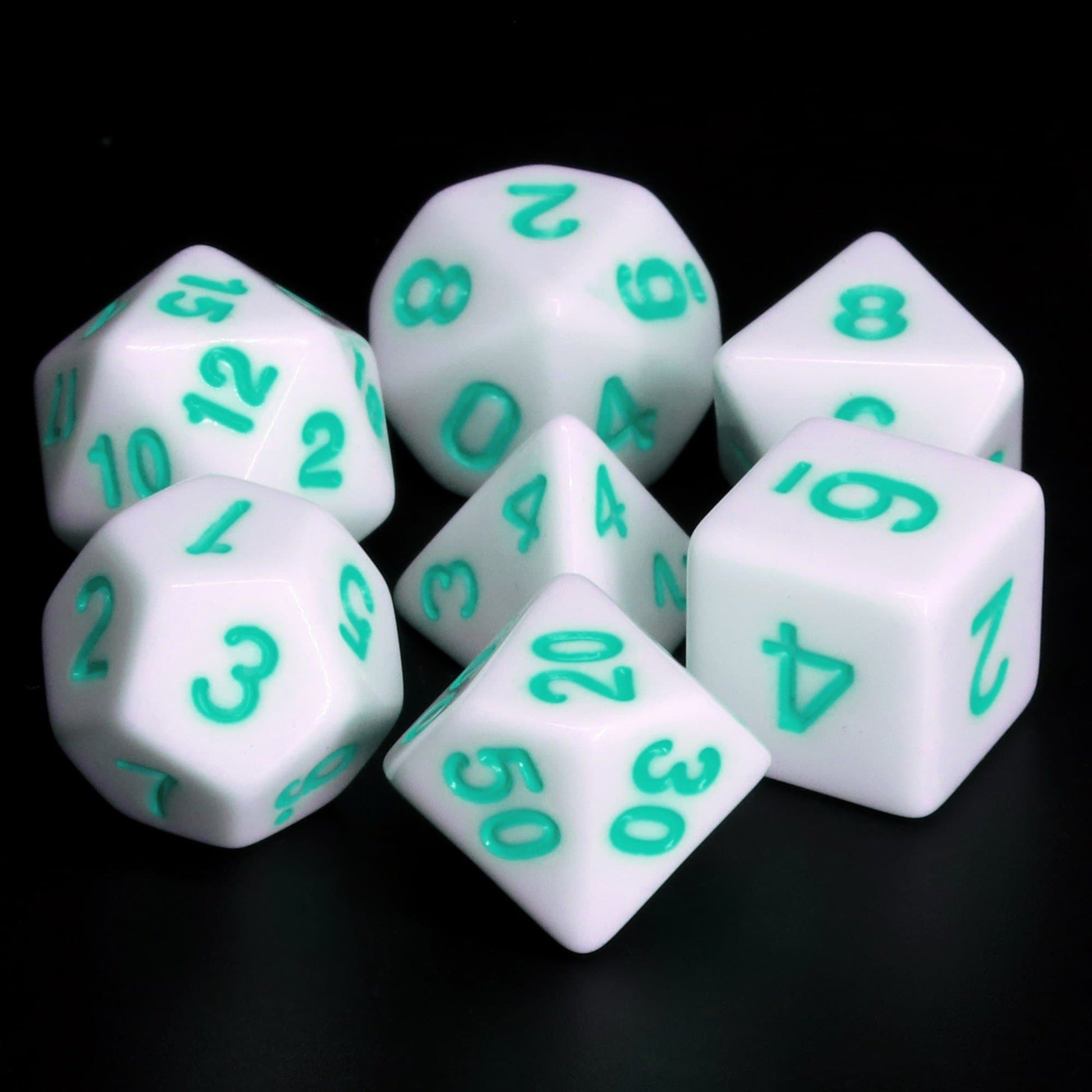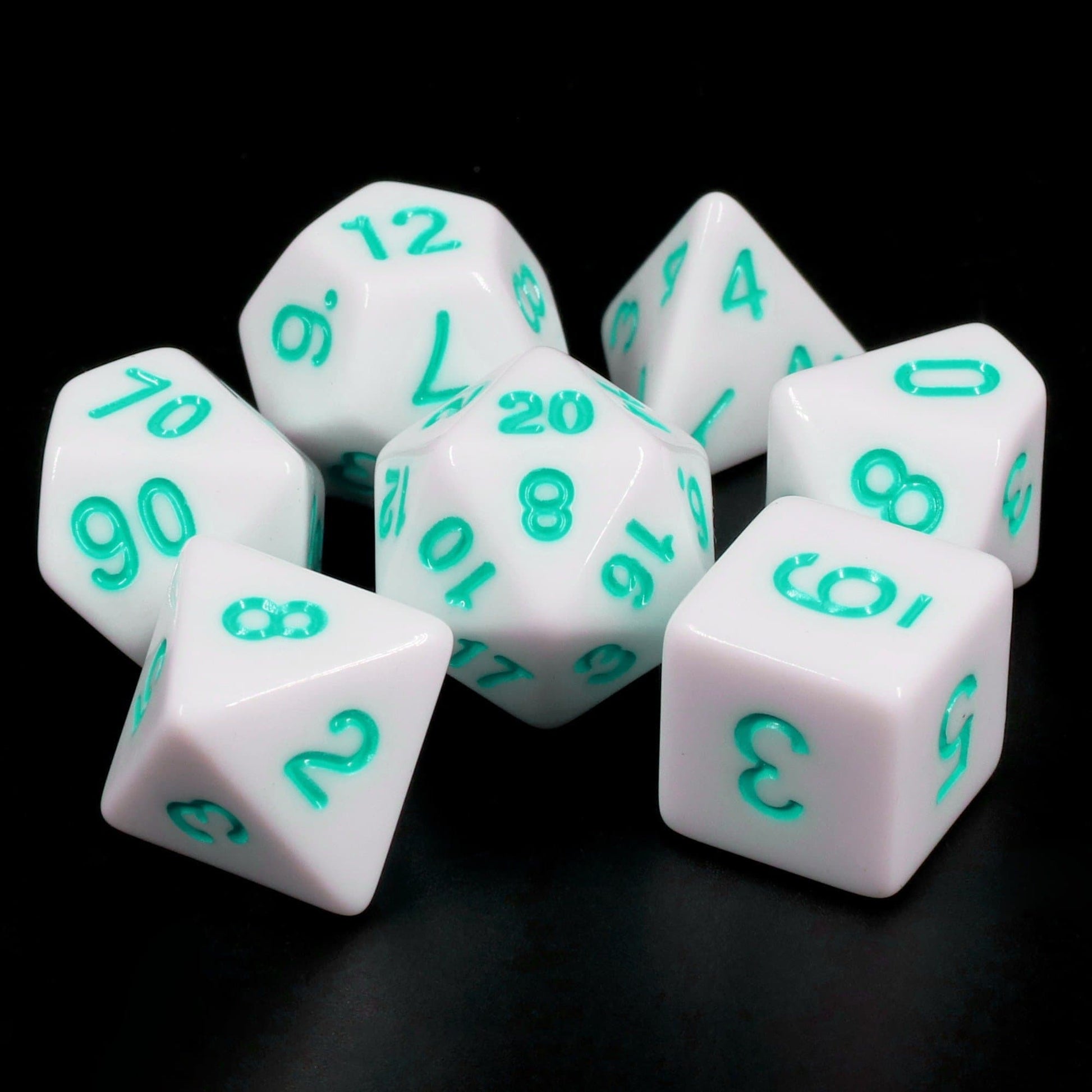 Polyhedral Dice Set | Acrylic | Solid White (Teal Ink) | Set of 7 (D0101)