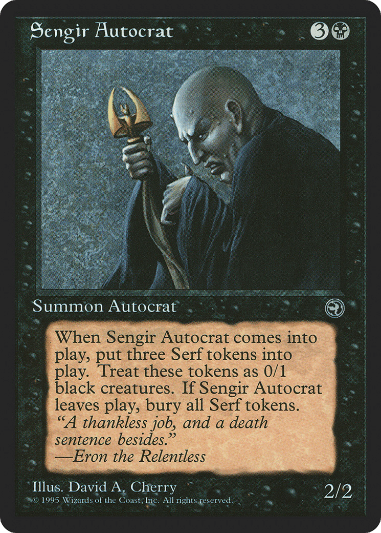 When Sengir Autocrat enters the battlefield, create three 0/1 black Serf creature tokens.