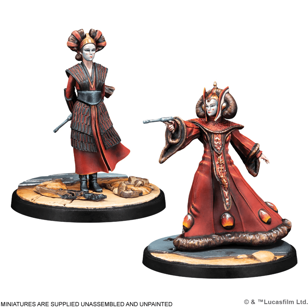 An iconic Queen of Naboo, Queen Padme Amidala and her entourage enter Star Wars: Shatterpoint in this pack! Committed to public service from a young age, Padme Amidala fights for her people on the floor of the Galactic Senate to the streets of Theed and beyond. She is joined by her courageous handmaidens, including her decoy Sabe who often protects Amidala by impersonating her. In addition to a full squad of four miniatures–Queen Padme Amidala as a Primary Unit, Sabe as a Secondary Unit, and two Naboo Royal Handmaidens as a Supporting Unit–that can be fielded together or alongside other Star Wars: Shatterpoint miniatures, this pack also includes the unit, stance, and order cards to get these characters into the fight.
