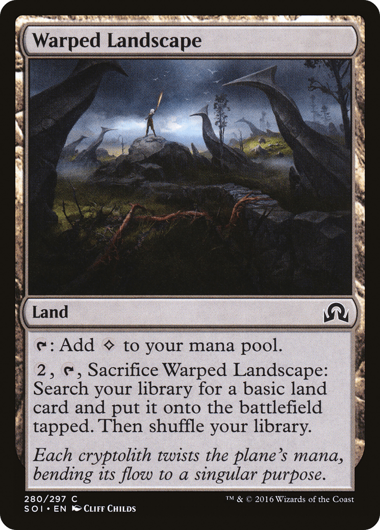 {2}, {T}, Sacrifice Warped Landscape: Search your library for a basic land card, put it onto the battlefield tapped, then shuffle.